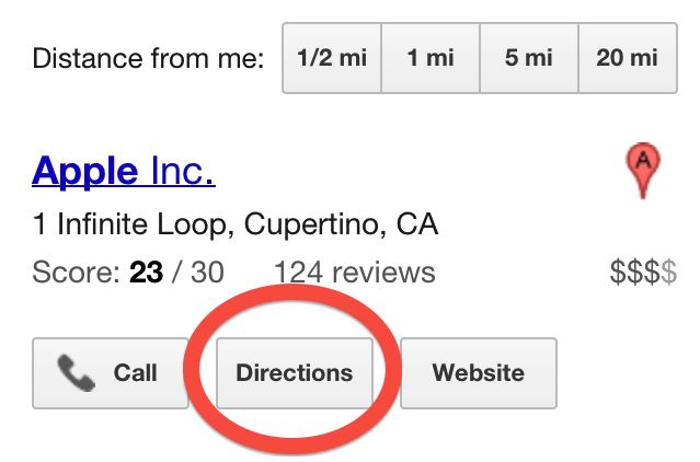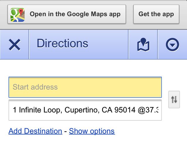 A fullscreen banner with a prominent link to visit the App Store is displayed when you first try to look at a location in Google’s web results on the iPhone. In our testing, the banner only appears the first time you attempt to get directions with Google. The rest of the time a link to get the app stays floating at the top of the screen in the Google Maps web view. You can choose to either open the mapping info in the native Google Maps app or go download it from the App Store.