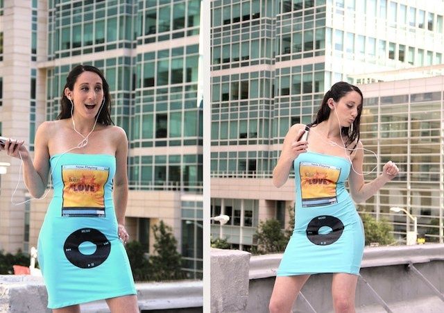 Step 2: Iron on the transfers. Printers don’t print white, so the iron on transfers won’t transfer the white color from your image. To fix that, cut the iPod screen on the printed sheet, lay the sheet on white stetchy fabric and trace outline with a pencil. Then cut out the rectangle you just outlined. Now attach the white fabric sheet to your dress using Steam-a-Seam. Now iron on your album artwork. Use the same process for the click-wheel.
