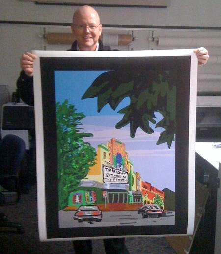 I had our local photography lab, Mike’s Camera, print the paintings on canvas and do what they call a “gallery wrap” so that the edges of the canvas wrap around a wooden frame. I printed the images with a black border so that the edges would be black. I also didn’t want my signature to end up hidden on the bottom edge because, let’s face it, the artist’s signature is the most important part of the painting. I put all full-sized images on a DVD, delivered it to Mike’s and they did the rest. Here is John from Mike’s holding up the first giclee archival print “Boulder Theater” to come off the printer: