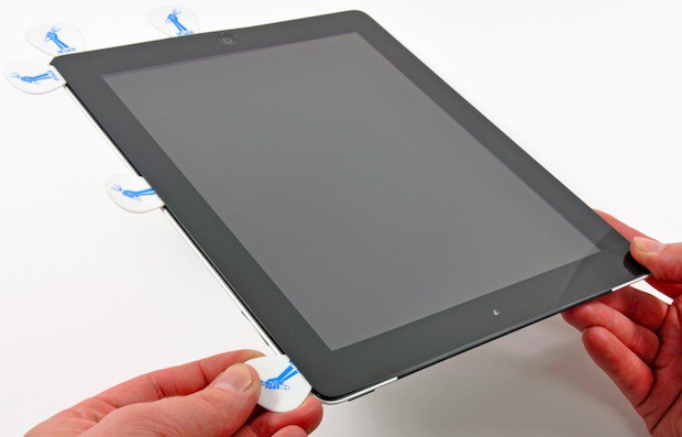* Qualcomm RTR8600 multi-band/mode RF transceiver for LTE bandsGetting inside the iPad is as tricky as we expected, knowing how tough it was to get into the iPad 2. The front panel is glued to the frame. We carefully used a heat gun to loosen the adhesive, worked to budge the panel with some guitar picks and plastic opening tools, and finally gently lifted it off with some heavy duty suction cups.