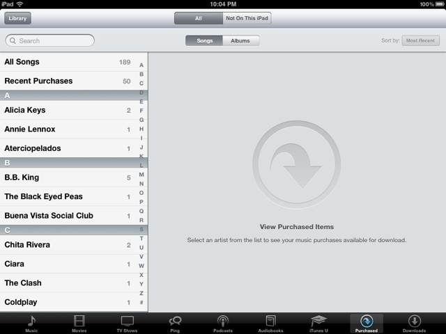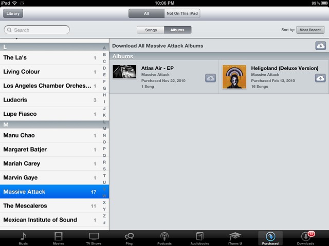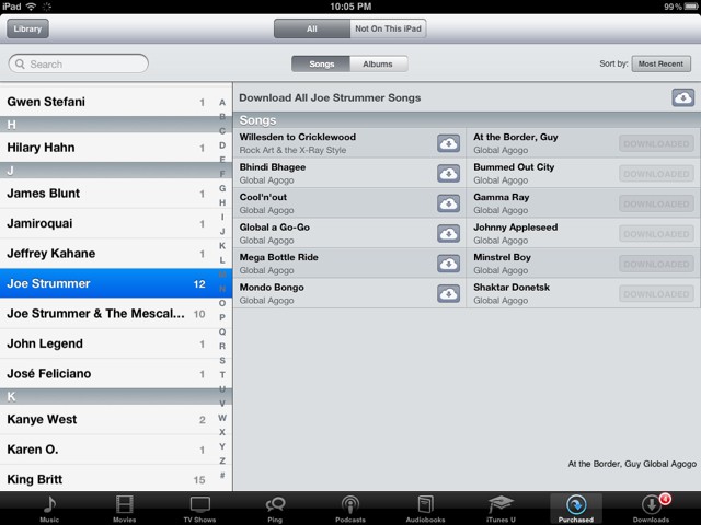 When you go to the online iTunes store, there’s a new tab for Purchased music — songs you’ve bought through iTunes. Hit the tab and it takes you to a list of artists whose songs you’ve bought.