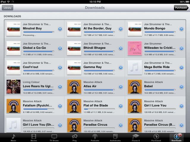 Here is the Downloads tab showing the status of all the music being downloaded. About 50 songs were downloaded in just a few minutes on a WiFi connection.