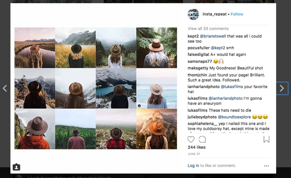 “There is a lot of mimicry everywhere in media, not just on Instagram,” the artist and filmmaker said in an interview PhotoShelter. “A purpose of insta_repeat is to critique originality in media creation through the lens (pun intended) of this one ‘genre’ of Instagram photography accounts.”