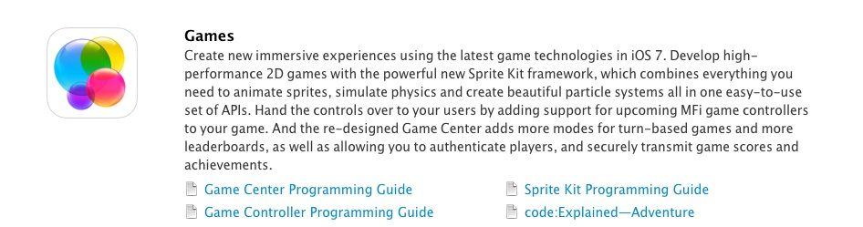 Today’s games aren’t animated frame-by-frame, like the cartoons of old, but rather with game engines that simulate physics in predictable ways. Engines like Unreal and Unity provide the framework so that console and mobile game developers can focus on game mechanics and artwork, instead of how to animate smoke or explosions. The new Sprite Kit, then, does this same thing for iOS (and OS X, to be clear). When a spaceship explodes, developers can keyframe the animation one flip-book frame at a time, they can use a software intermediary like Unity, or code their own graphic engine to make their explosion look as real as possible. Sprite Kit will add a third option: let Apple’s own iOS manage it. This should help developers of 2D games (for now) focus on the game experience rather than figuring out how to make spaceships move or smoke billow realistically. This is the first time that Apple has directly targeted game developers in its iOS guidance. It’s a big deal.