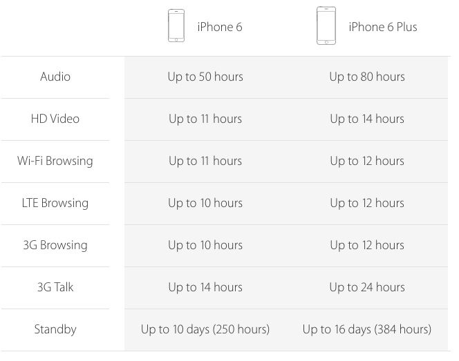 There isn’t a big difference between battery life in iPhone 6 and 5s, but the iPhone 6 Plus comes with a significant boost, getting 10 hours more 3G talk time over the iPhone 6, and 30 hours more life when playing audio. Apple users who are tired of being a lonely wallhugger should definitely be tempted by the 6 Plus’ extra juice.