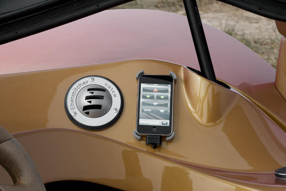 Called iChange, it features a no-key ignition that starts via an iPhone. The device clips onto the dash, once the phone is inserted, a green “start” button appears on the iPhone’s display. With a touch of a button, the iChange purrs to life. From the iPhone, drivers can also control stuff like headlights, too.