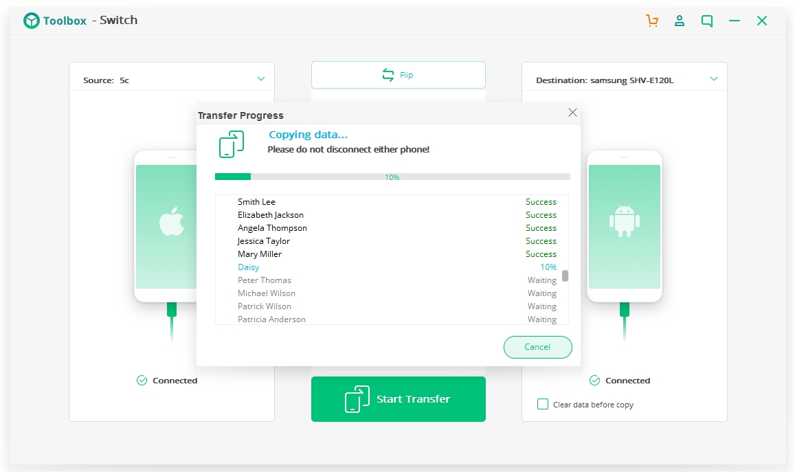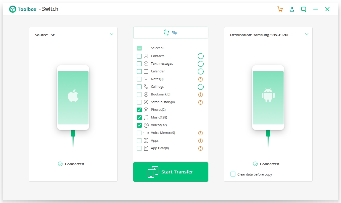 Launch iSkysoft Toolbox – Switch and you’ll see a clean, clear menu with all the tools laid out. Connect the old and new phones to your computer, and the app automatically reveals all the files you can transfer. If you want to switch source and target devices, just click “flip” to reverse the flow of data. Select the files you want to move, click “start transfer,” and wait for the popup window to tell you when it’s done.