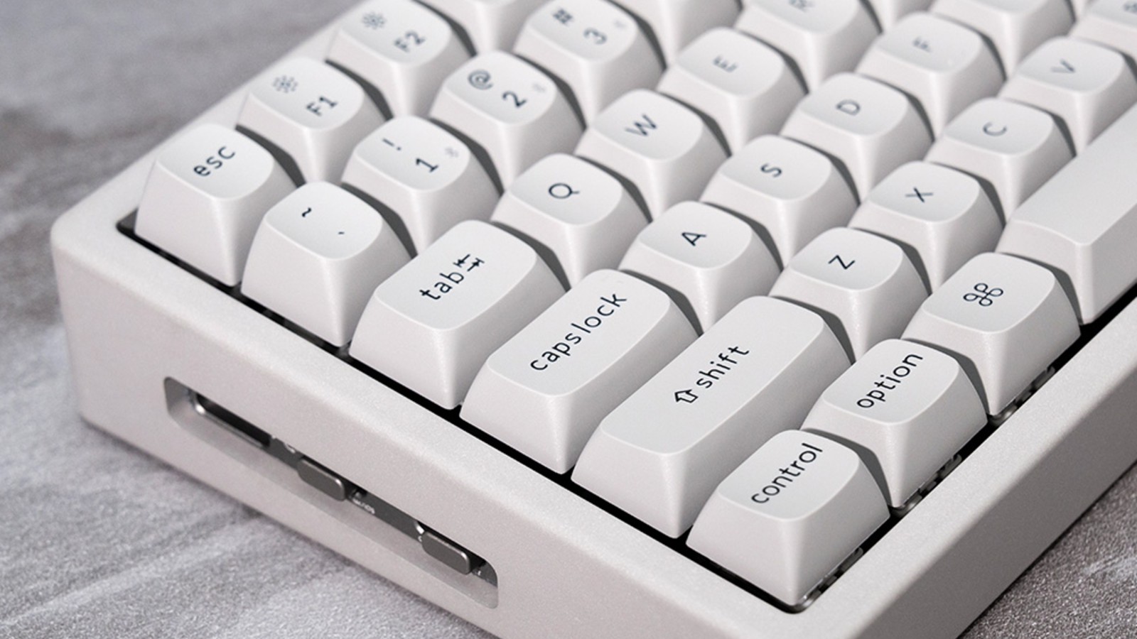 Keychron describes the exterior finish as marble-smooth. So despite being literally made of cement, it isn’t rough or unpleasant to the touch. The keycaps are cement-gray double-shot PBT, chosen to match the material’s muted, industrial palette.