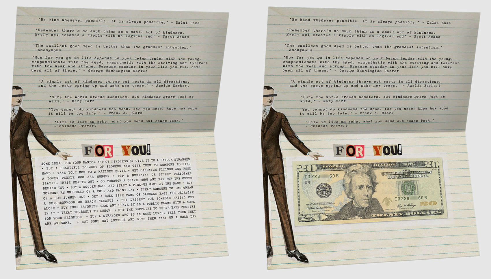 Each card is designed to hold the bill of your choice. The website recommends a $20 and to make it more fun, sending the card anonymously.