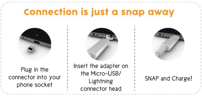 You simply slide your Lightning cable into the ZNAPS adapter sleeve, which is magnetically attracted to the little Lightning dongle you can plug into and leave connected to your iPhone or iPad power port. To power up or sync your iOS device, simply move your adapted Lightning cable near the magnetic dongle and snick them together.