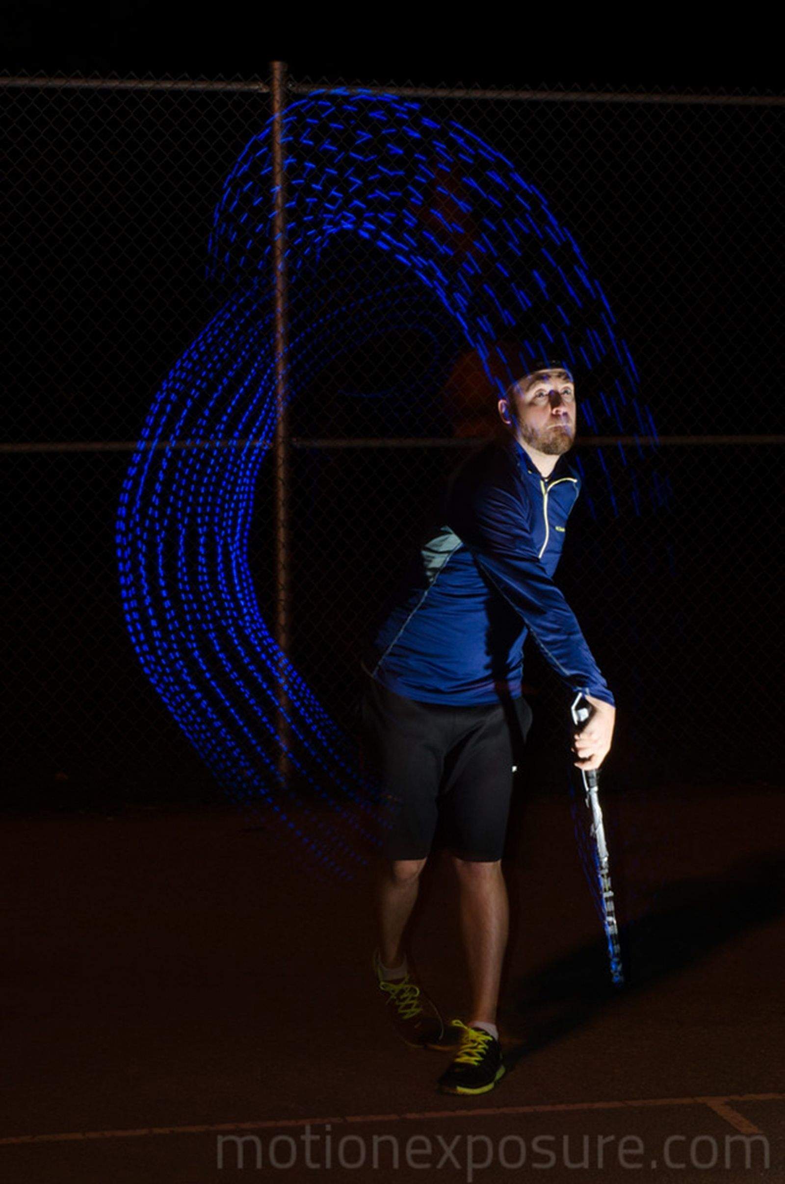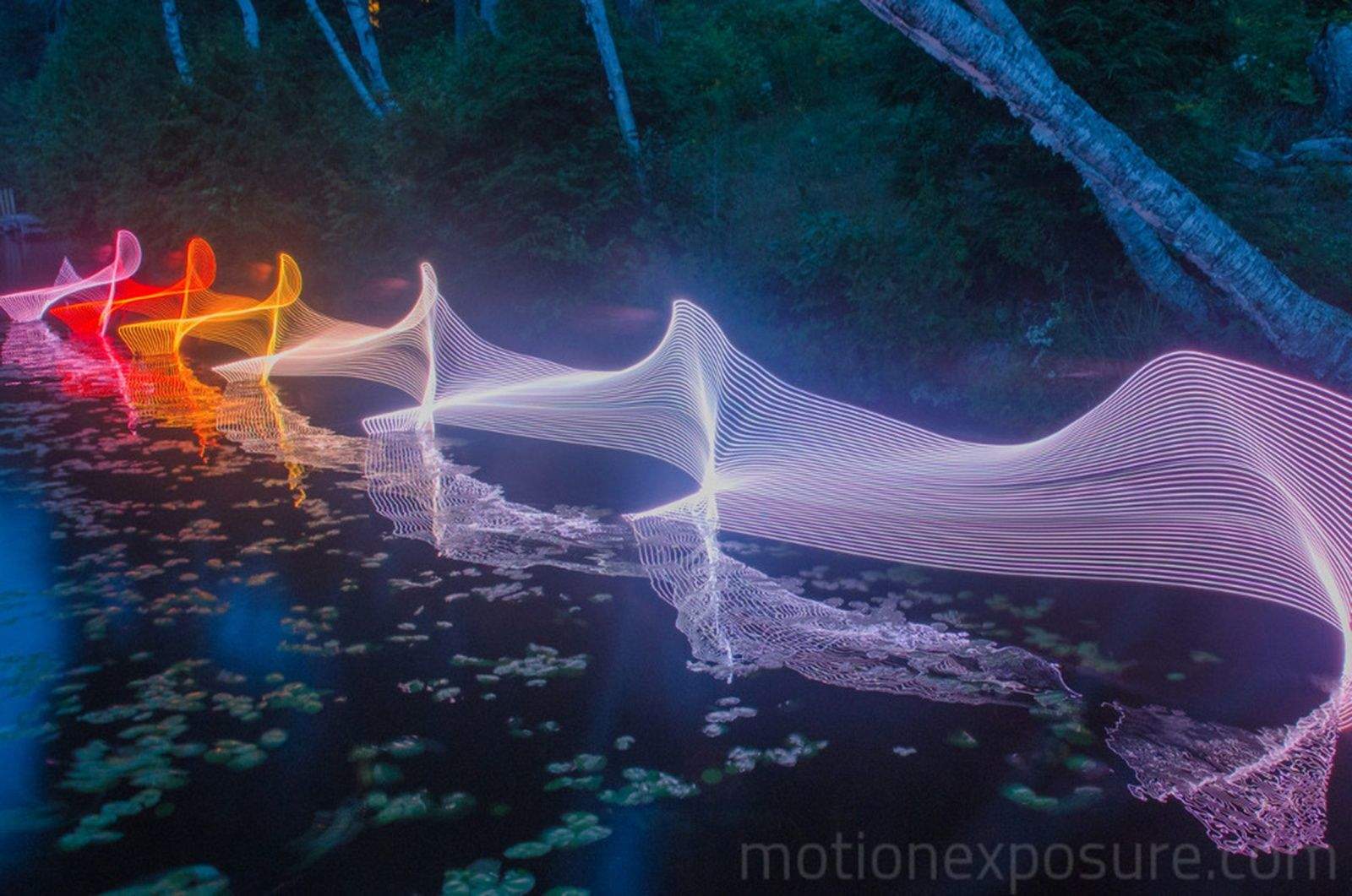 He attaches programmable LED light strips to objects, like a kayak paddle, or to the clothing and limbs of a moving body to reveal repetitive patterns of light.