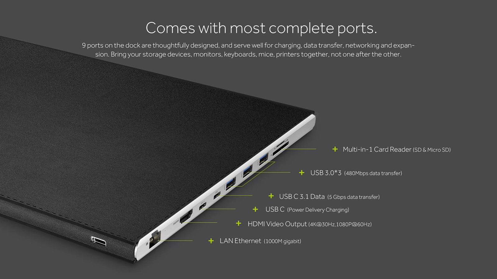 The DockCase is a leather case with a built-in aluminum alloy dock with nine ports, including Ethernet, HDMI, SD and MicroSD card readers, and three for USB 3.0.