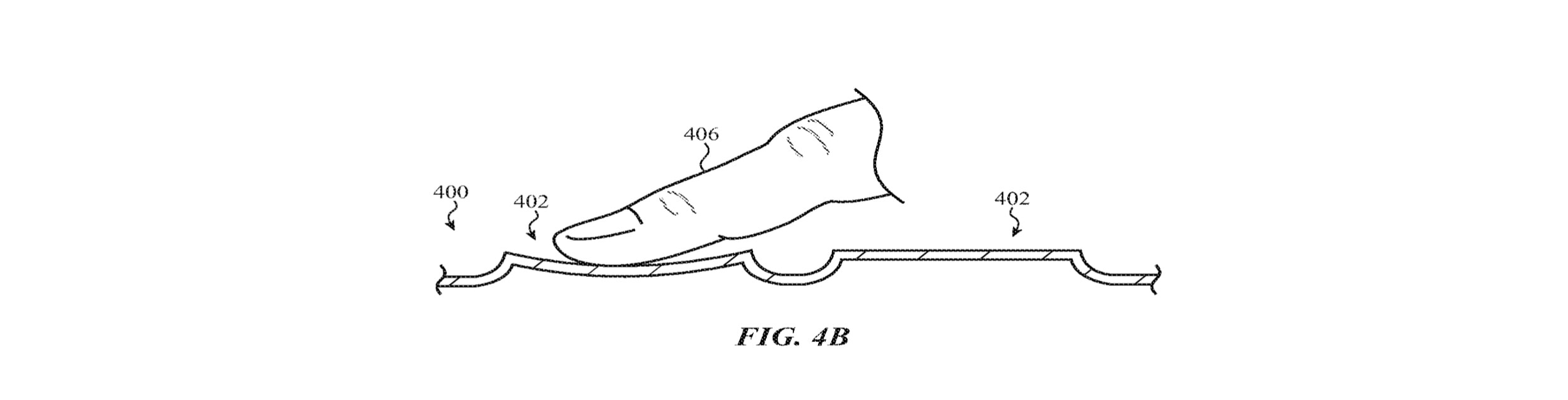 It consists of “a glass top case“ with “an array of raised key regions, and a sensing system below the glass top case and configured to detect an input applied to a raised key region of the array of raised key regions. The array of raised key regions may form a keyboard of the device.”