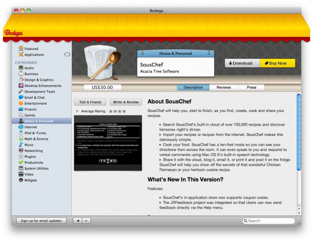 Unlike the Mac App Store, Bodega has a wish list for keeping track of paid apps you want to buy later. There are screenshots for apps, developer info, customer reviews, and other Apple-like aspects of Bodega that make the shopping experience familiar. You can download Bodega for free from Freshcode’s website.