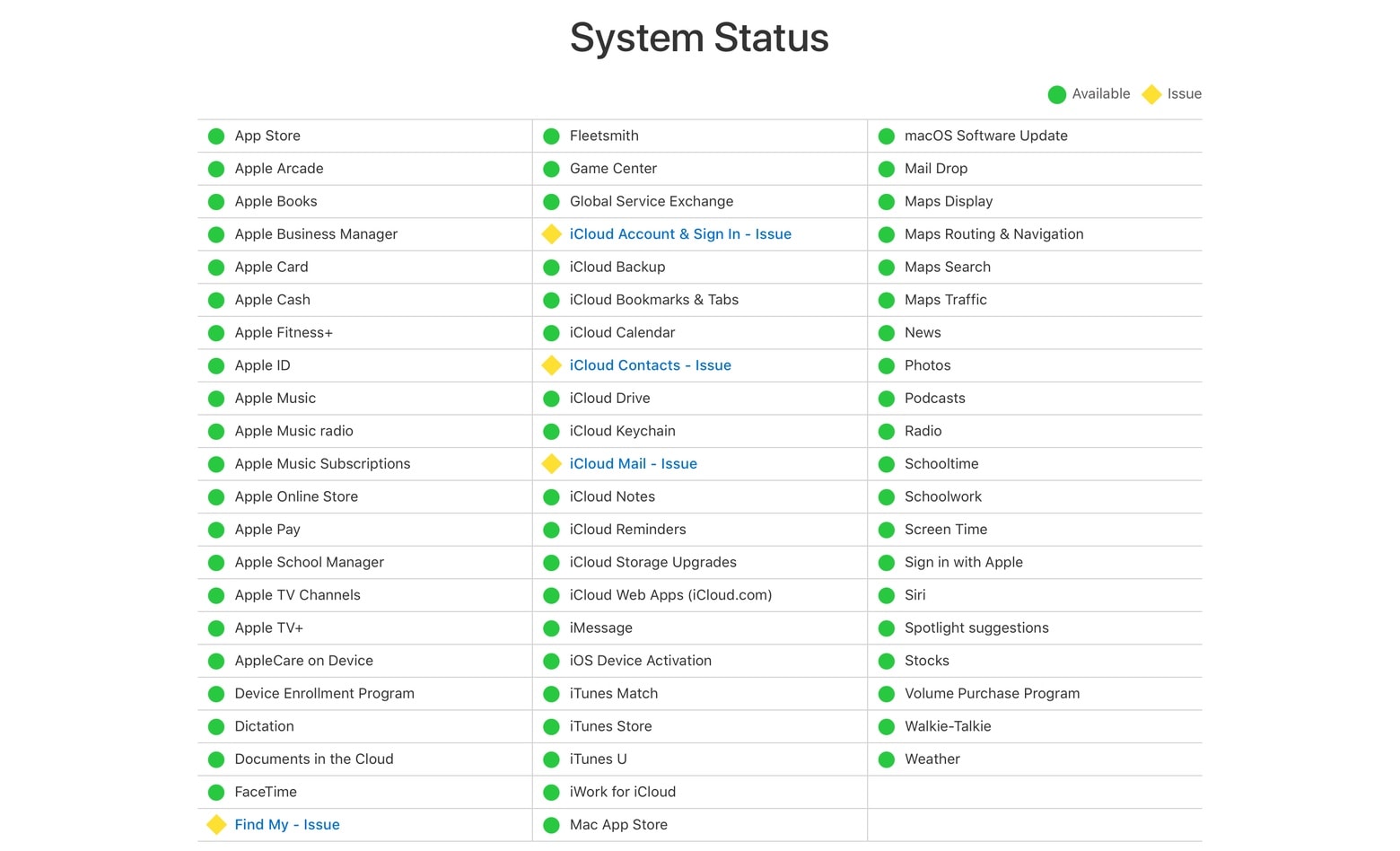 A check of Apple’s official System Status page shows the quartet listed as having “issues.” That includes: