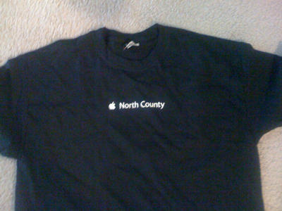 Apple also recently opened a shop in nearby Carlsbad, but PC didn’t make the trip. Apparently, lovers of sensible ties and cheap hucksterism prefer Escondido. Click through for a shot of the North County T-Shirt and another pic of PC on duty.