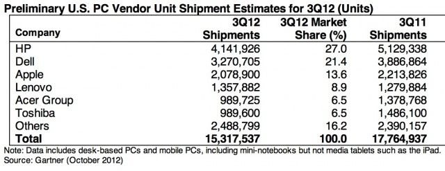 On the Apple side of things, Gartner reports that the Cupertino company is perched as the number three PC vendor in the United States with 2,078,900 Mac shipments in Q3. That means Apple owns 13.6% of the PC market, while HP and Dell hold first and second place with 27% and 21.4% respectively. Apple saw a 6.1% decline in Mac shipments from Q3 of 2011, but that drop is nowhere near as bad as the other competitors. For example, Toshiba has seen a 33.4% decrease in shipments since this time last year. Ouch.