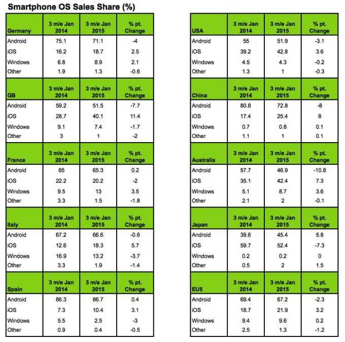 “Leading into Chinese New Year, Apple iPhone 6 and 6 Plus drove sales to an unprecedented high in urban China with iOS’ share of the smartphone market reaching 25.4 percent – a 4.5 percentage point increase over the same period in 2014”, noted Carolina Milanesi, Kantar’s chief of research.