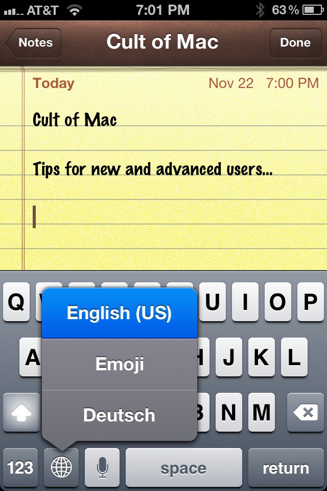I use multiple keyboards on my iOS devices English (US), Emoji, and Deutsch (German). It used to be a drag to have to click the globe icon on the keyboard multiple times to get to the keyboard you needed, but not any more. You can reach all your keyboards with just one finger!