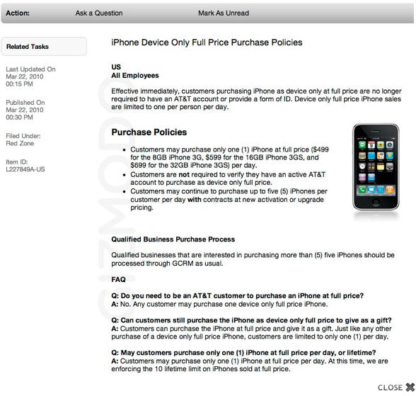 First announced internally on Monday, the Apple memo obtained by Gizmodo states “customers purchasing iPhone as device only at full price are no longer required to have an AT&T account or provide a form of ID.”