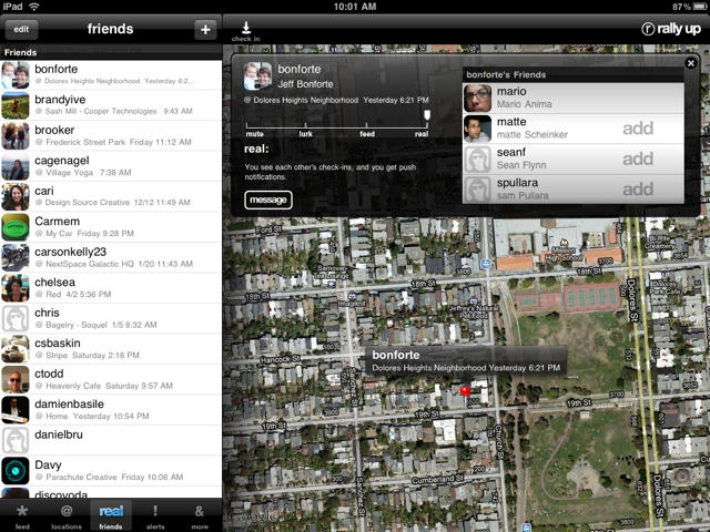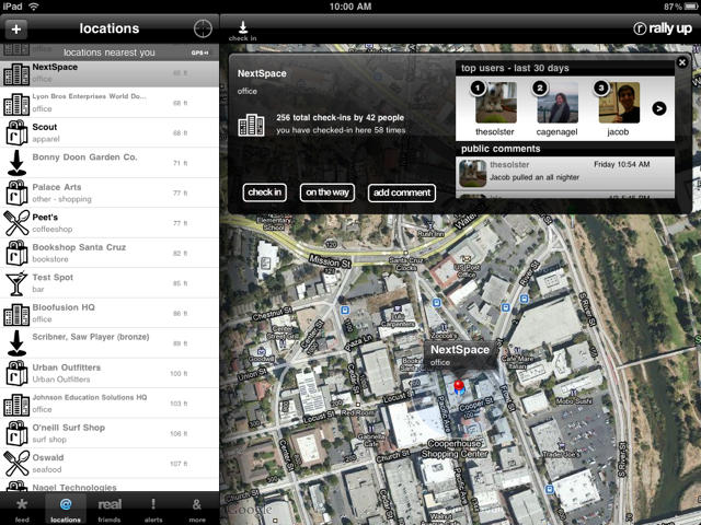 “The iPad really changes the experience of a [location based social app],” said Rally Up founder Sol Lipman. “It becomes less of a push app and more of a pull app, in my opinion. You want to sit and explore, not just wait until your friend tells you what they’re up to.”