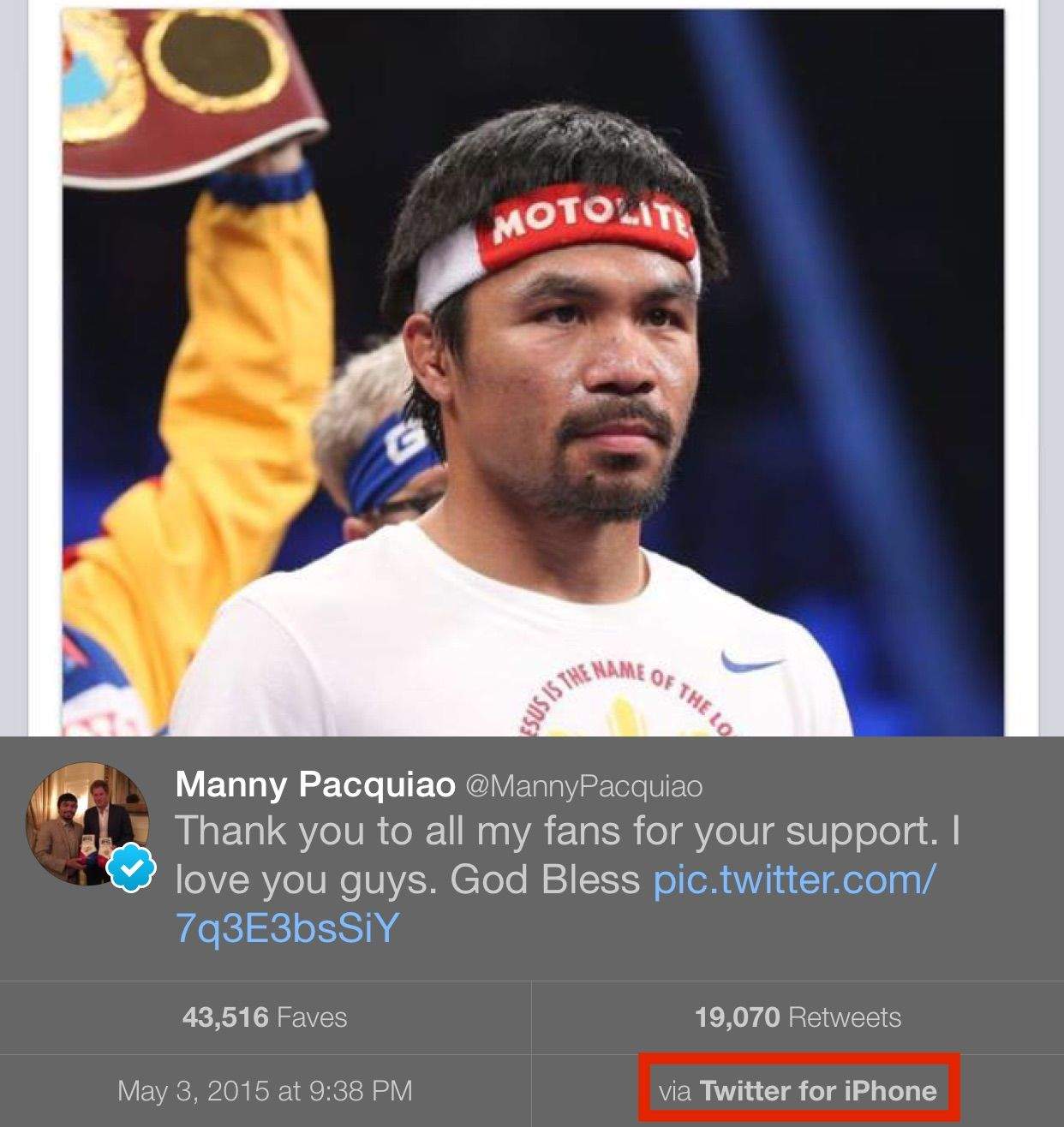 As part of the sponsorship, Pacquiao – who’s tweeted from an iPhone from years – crafted his tweets on a Samsung Galaxy S6, including two selfies he posted at weigh-in and on his way to the ring with Jimmy Kimmel. Samsung also filmed an entire behind-the-scenes video of Pacquiao on a Galaxy S6 Edge. But now that the fight’s over and Pac-Man’s cashed in, he’s back to using Apple devices.