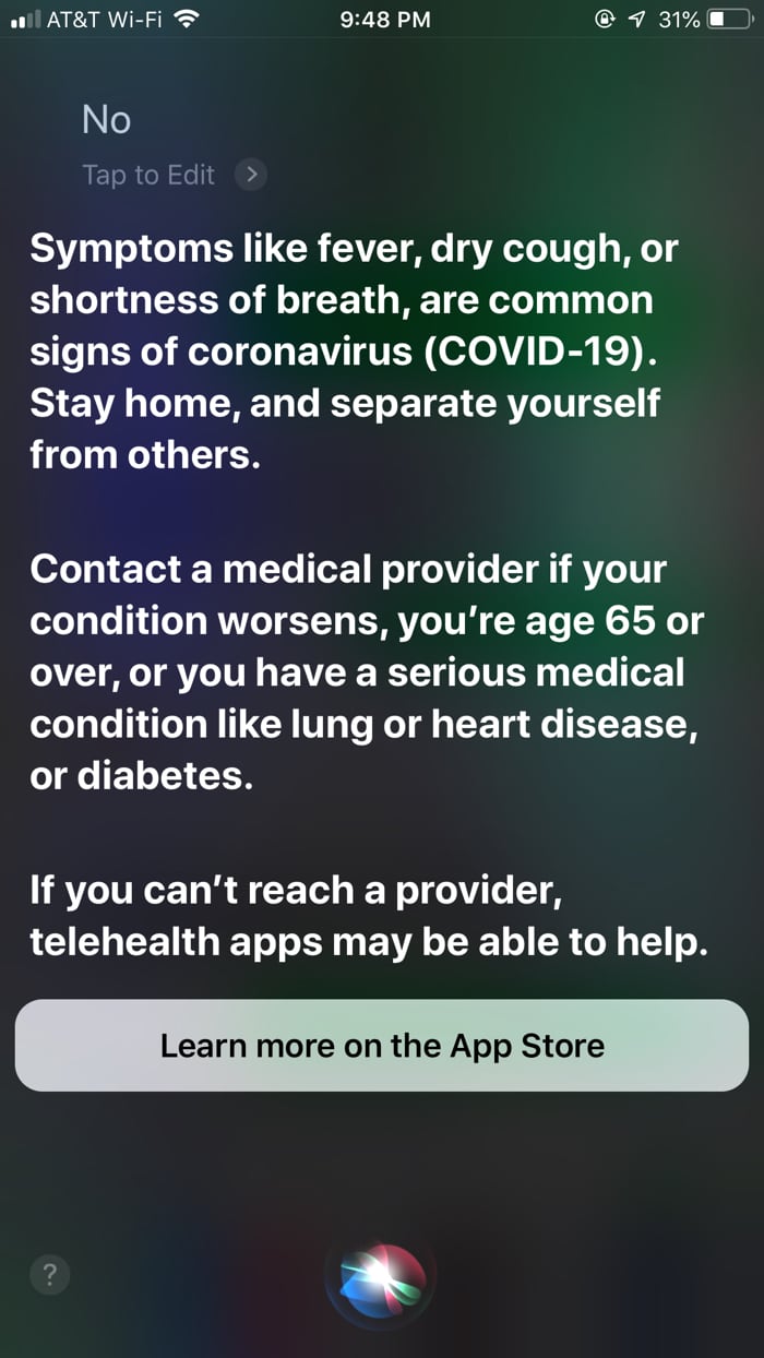 The voice assistant begins by asking if a user has various symptoms. Depending on the answers, Siri instructs users to either “stay vigilant” for symptoms or “stay home, and separate yourself from others” and consult a medical professional or other telehealth apps.