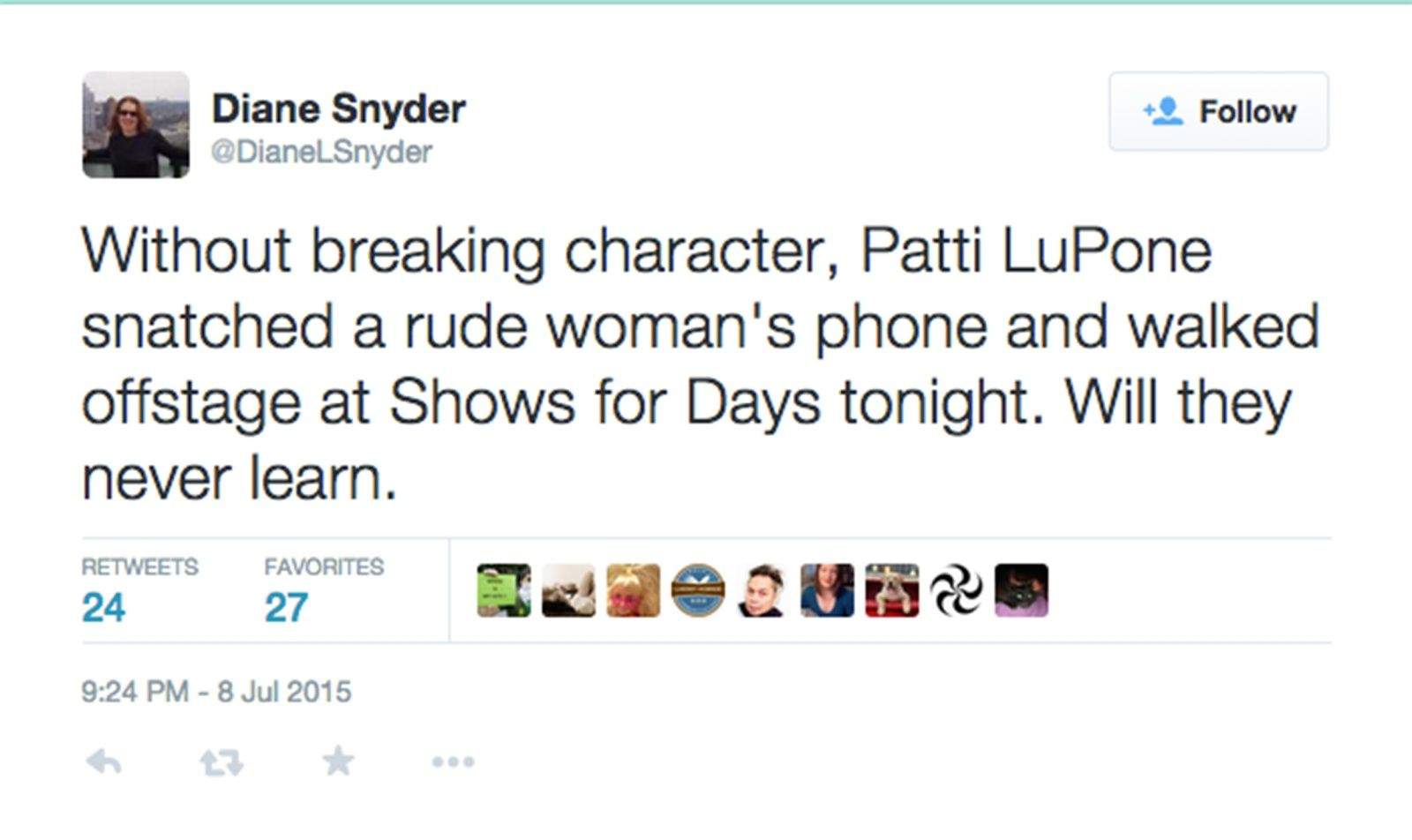 Some in the audience tweeted about the incident in support of LuPone and did so after the show was over.