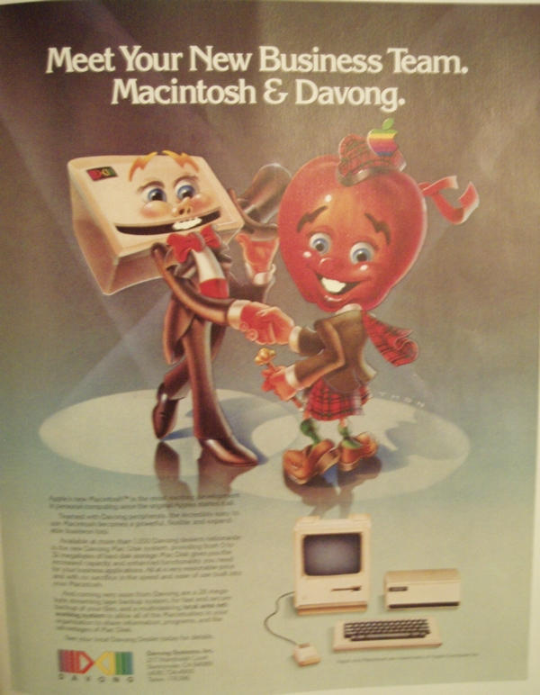 Still more baffling is the fellow on the left, who, near as I can tell is the personification of…a hard drive. In coat and tails. Because when I think personality, grace, humor and charm? Totally thinking about an 8″ platter inside a huge beige box. The artist was clever to incorporate the actual design element of the black line on the front into a smile, but why not make the Mac design into a person, too? I mean, the Mac has a face! But no, we get Mr. Personality the Hard Drive (‘Cause he’s so ugly!) and Apple-Man McGee. Business partners for life.