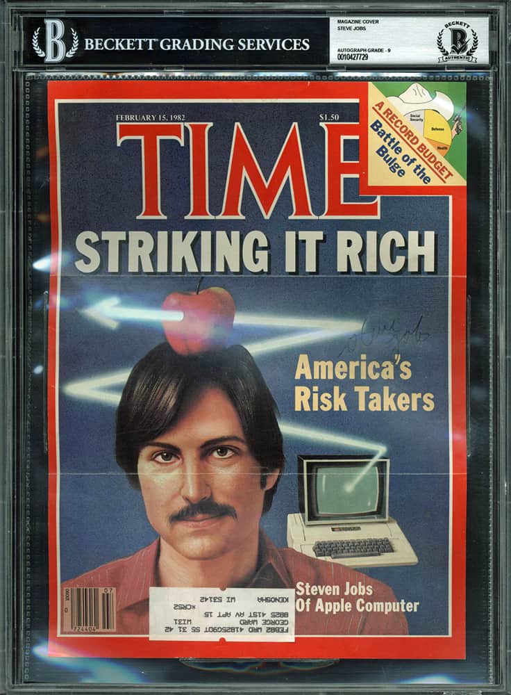 The seller, Press Pass Collectibles, has even dropped the advertised price on eBay for the signed cover from Feb. 15, 1982, showing a young, mustachioed Jobs with the headline, “America’s Risk Takers.” It was Jobs’ first TIME cover, which made him the first public face of the personal computing era.