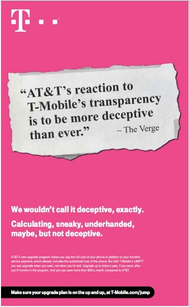 The ad, which will be published today, the same day AT&T reports its quarterly earnings, features a quote from a recent article by The Verge that reads: “AT&T’s reaction to T-Mobile’s transparency is to be more deceptive than ever.”