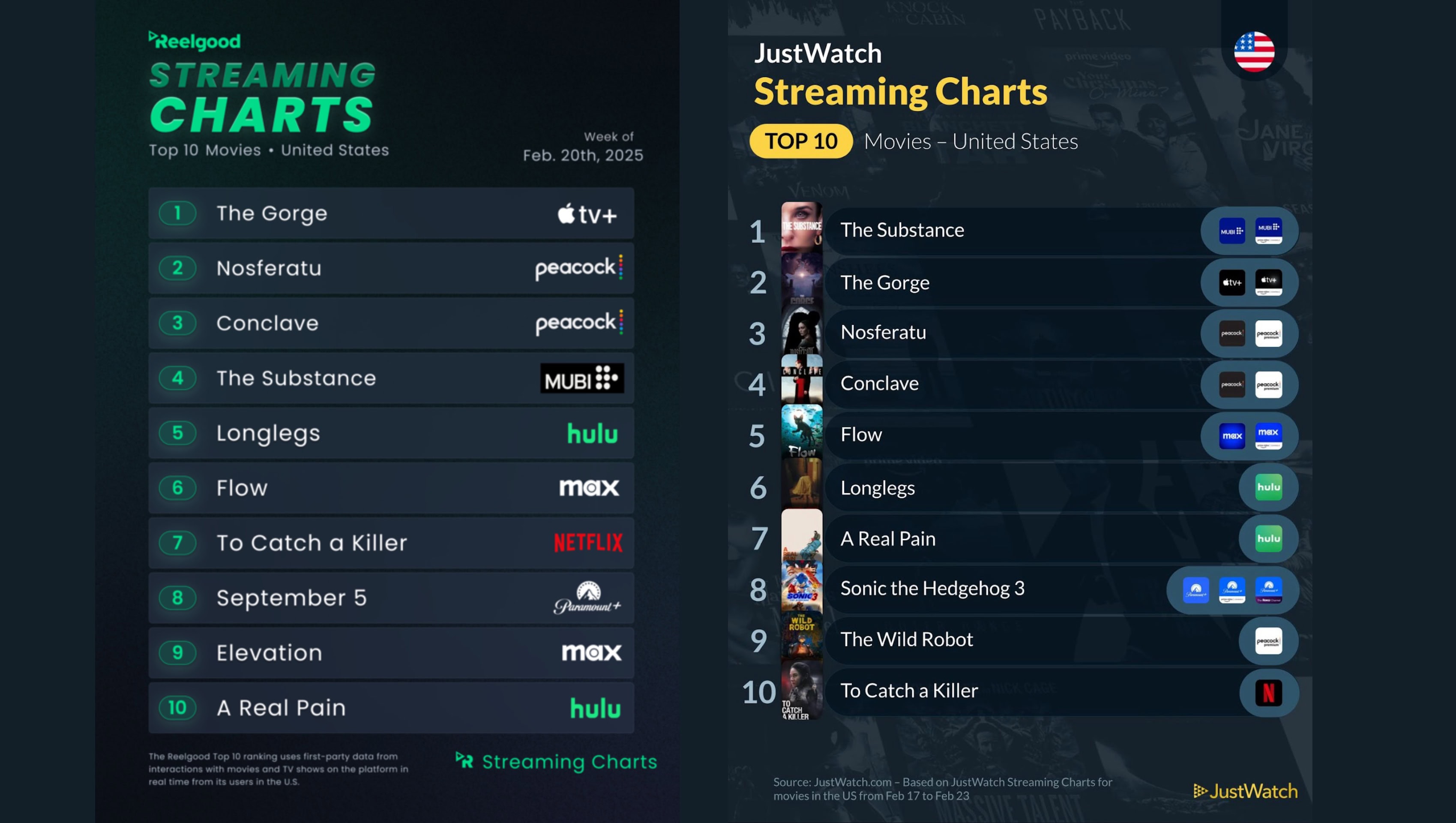 Movie and TV search engine Reelgood publishes a weekly list of the top-rated movies, and The Gorge sits at No. 1 for the week of February 20 through February 26, just as it did the previous week. Rival service JustWatch put the show in the No. 2 slot on its list of the 10 most popular films on streaming for the week of Feb. 17 to Feb. 23.