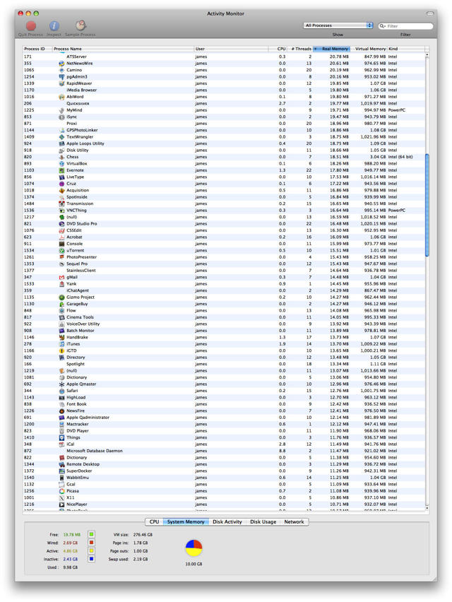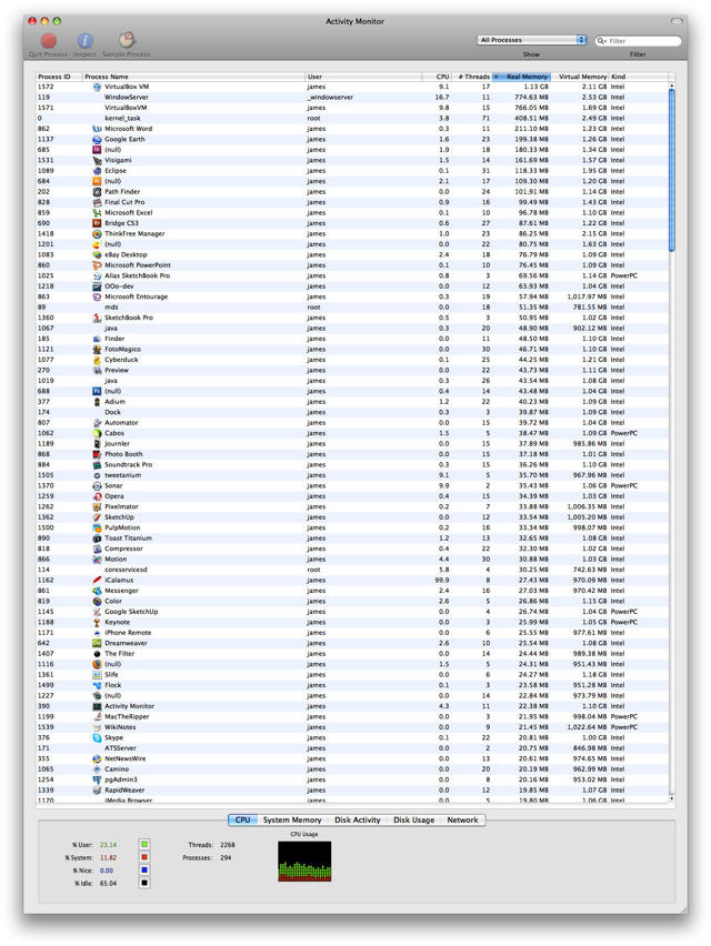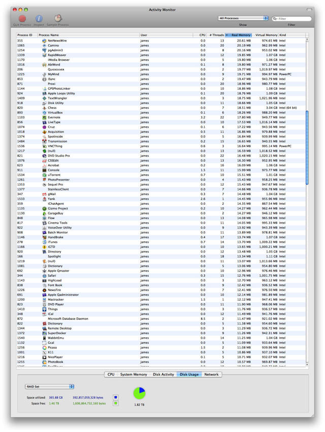 James’ machine is Mac Pro 8 core, with 10GB RAM, 30″ NEC 3090 monitor, and 2 1TB Samsung drives raided together. He has a lot of high end apps running, including all of Final Cut Studio, all of Adobe Creative Suite CS 3 Design Premium, all of Office 2008, all of iWork 08, Google Earth, Windows XP and Crunch Bang Linux in virtual box , Sling Player, Filemaker xcode and mmaannyyy more.
