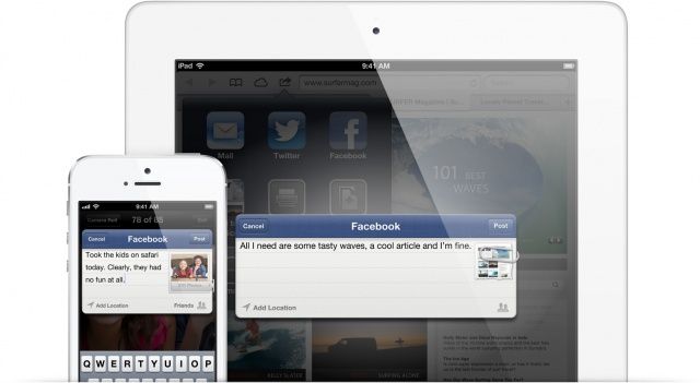 Facebook integration allows you to post messages, videos, photos, web pages, maps, and more on your favorite social network from a number of iOS apps, including Safari, Maps, Photos, iTunes, Notification Center, and more.