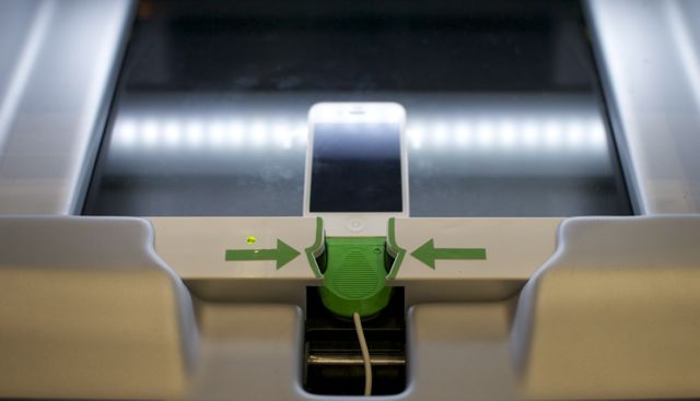 In the first step of the process, you need to take your gadget out of its case and then put a QR sticker on the back. You then place the device in the tray and it starts by scanning the device, trying to figure out what kind of gadget it is.