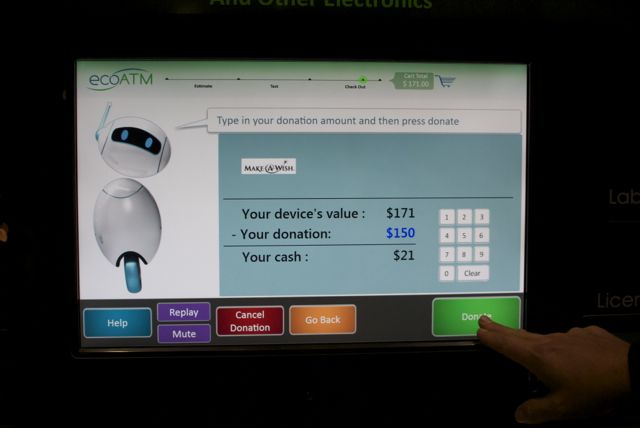 Once ecoATM figures out if your device works, it gives you a final estimate. If you choose to accept this estimate, you can then tell ecoATM to either give you the full cash amount or donate part of all of it to charity. A few minutes later, your device is gone, and a wad of bills has been spit out in its place.