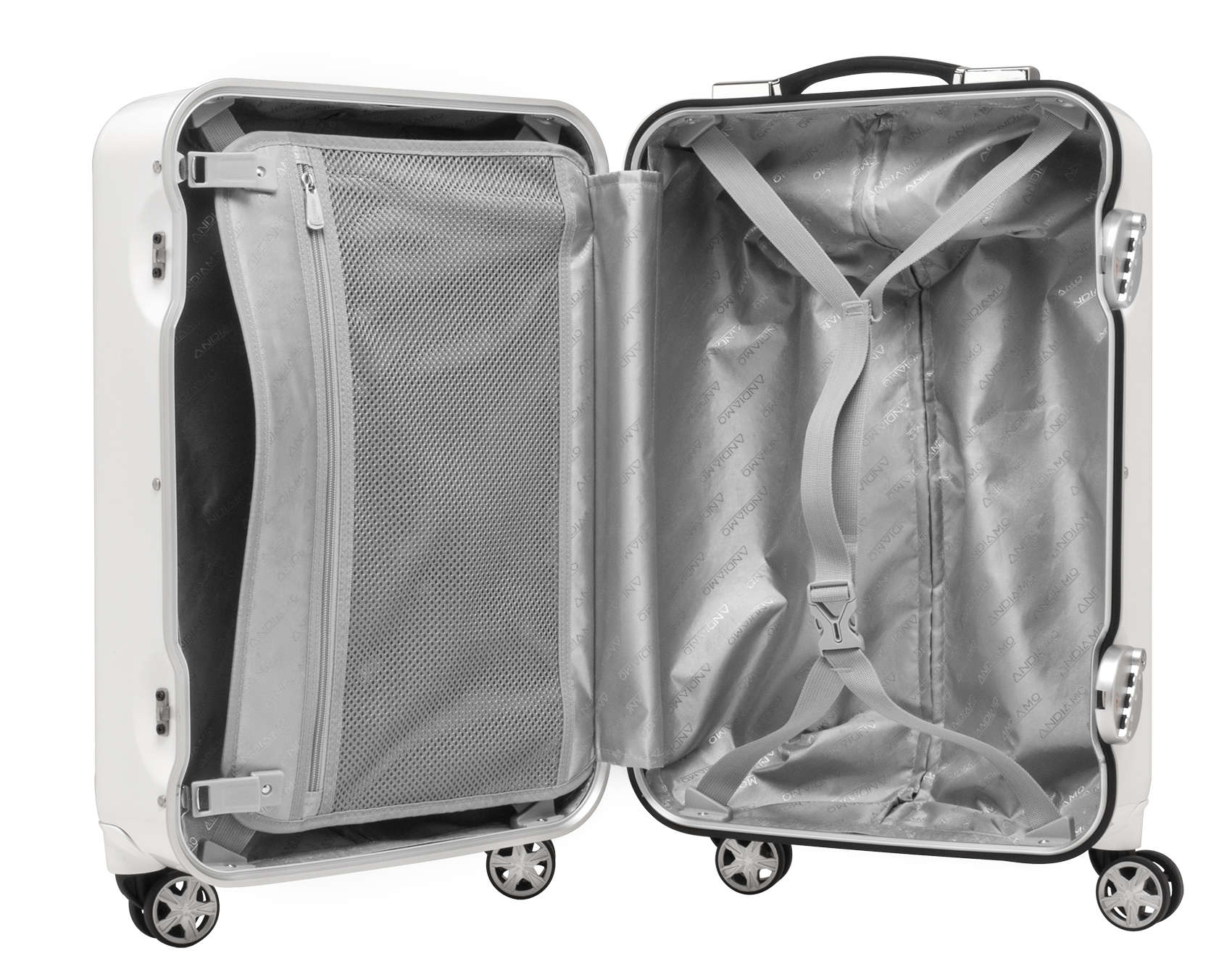 The bag sits on four spinner wheels and is a 100 percent polycarbonate case with aluminum frame.