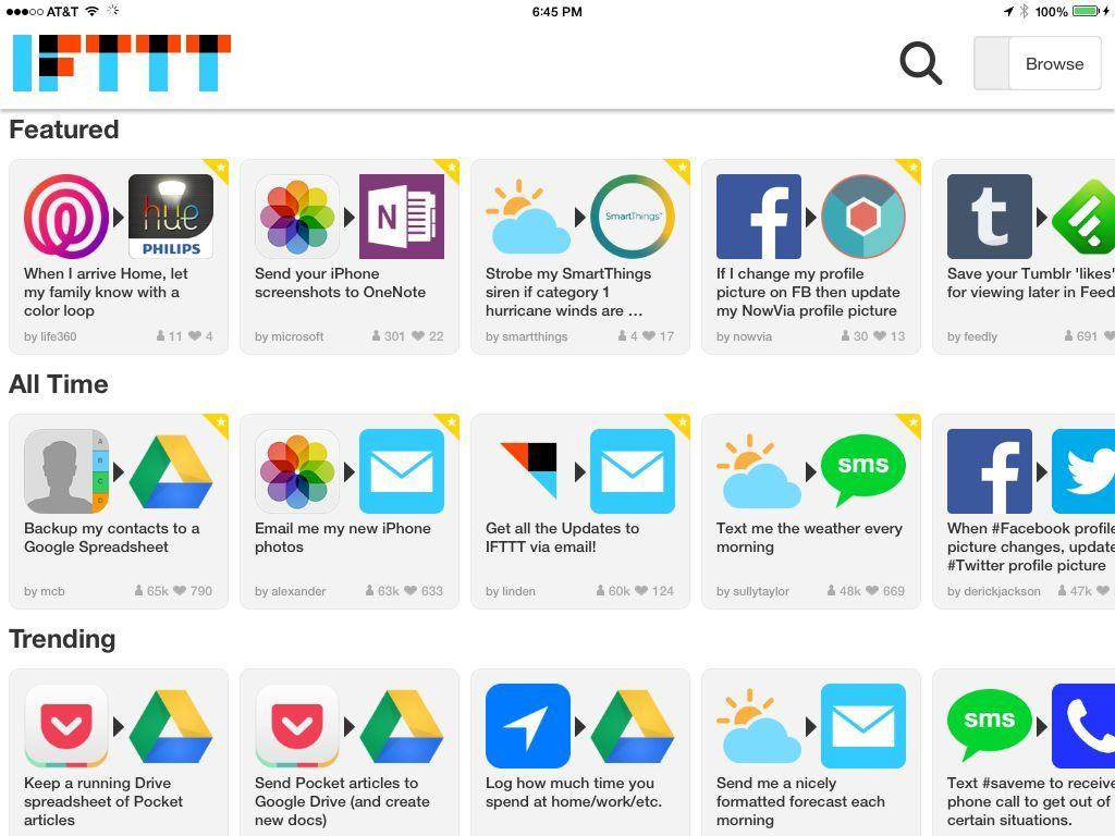First of all, the IFTTT app has moved what it calls Collections front and center. You’ll be able to browse through dozens if not hundreds of recipes all from topical sections like “Recipes for the Constant Traveler,” or “Recipes for the Photo Enthusiast,” and so on.