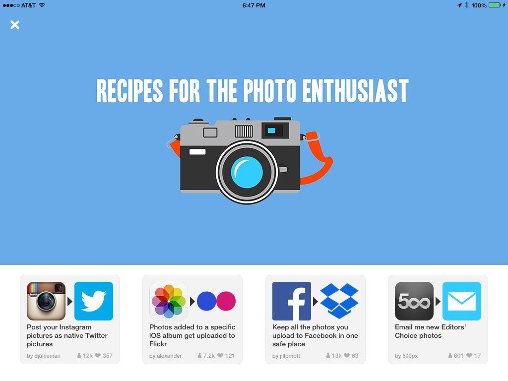 The latter, for example, contains recipes to post all your Instagram photos as native Twitter picture formats, or send any Photos you put in a specific iOS album over to Flickr. A super useful one is to send all the Photos you upload to Facebook from your iOS device to Dropbox in a special folder, so you don’t have to rely on Facebook to keep your stuff for you.