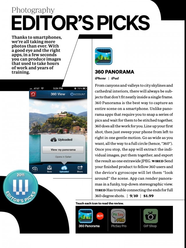 “From Angry Birds to Zite, mobile apps are redefining how we experience the world, whether we’re at work or play. But with hundreds of thousands of apps available, choosing the right software is becoming increasingly complicated. That’s where we come in. Our experts braved the app stores to search, download, test, crash, complain, and update—all so you don’t have to. Organized into seven categories—social, games, lifestyle, news, arts & entertainment, photography, and productivity—these are the apps worth knowing about.”