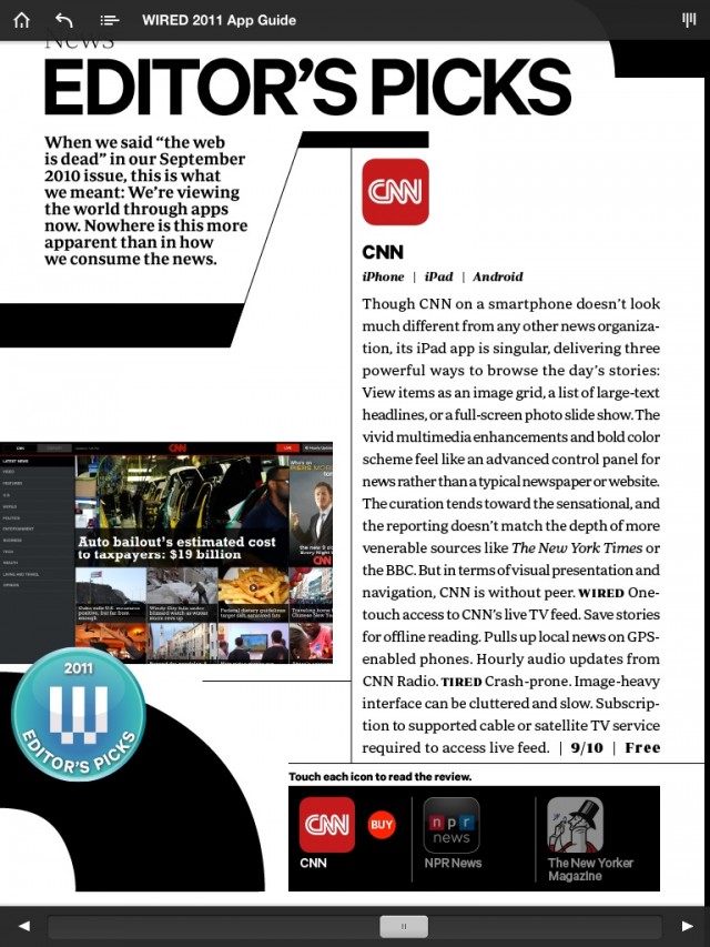 The Wired App Guide is beautifully designed for the iPad. It’s like perusing an interactive magazine full of awesome app reviews. The app takes advantage of iOS gestures and lets you launch the App Store from inside the app when you find something you want to buy.