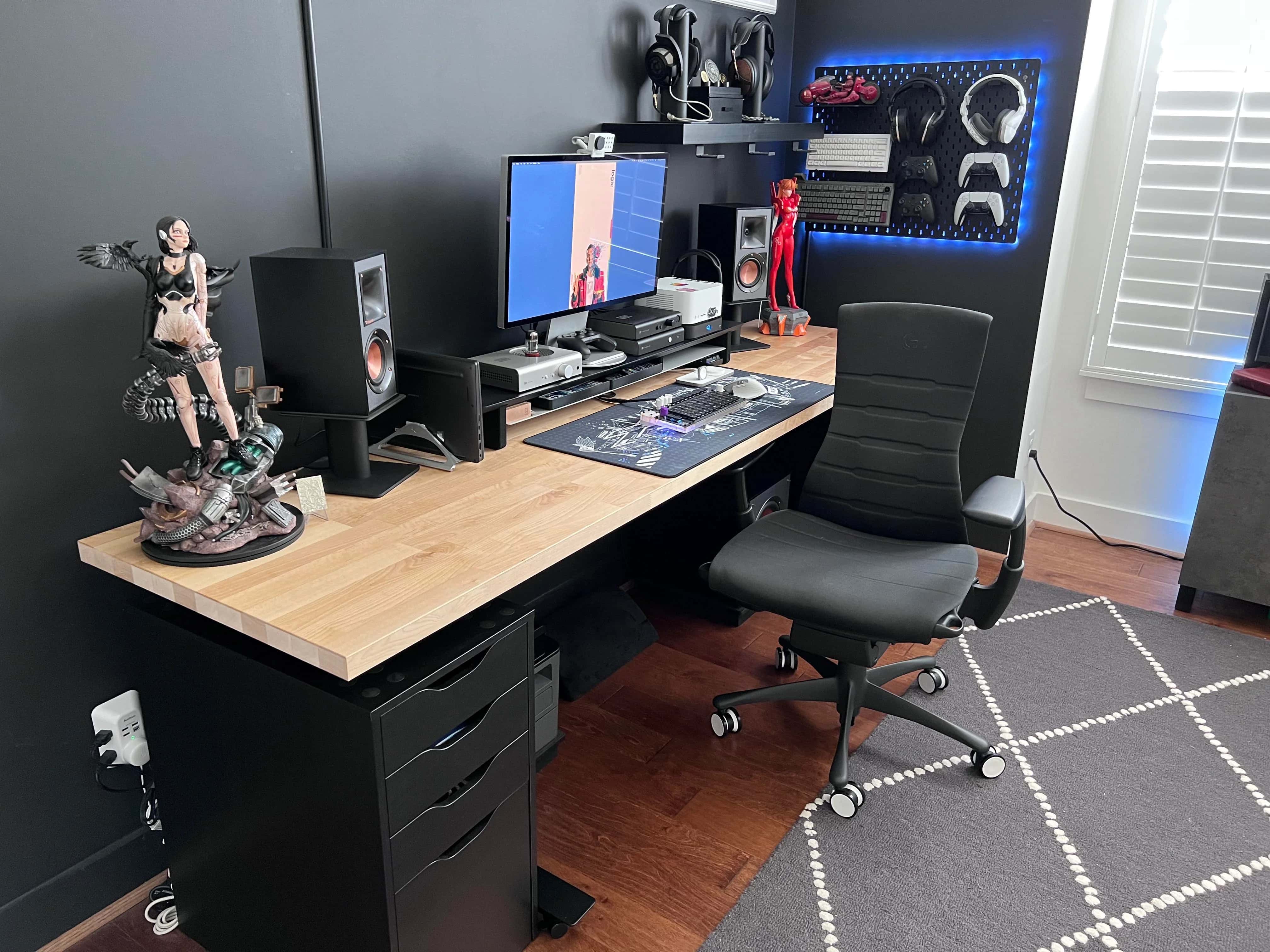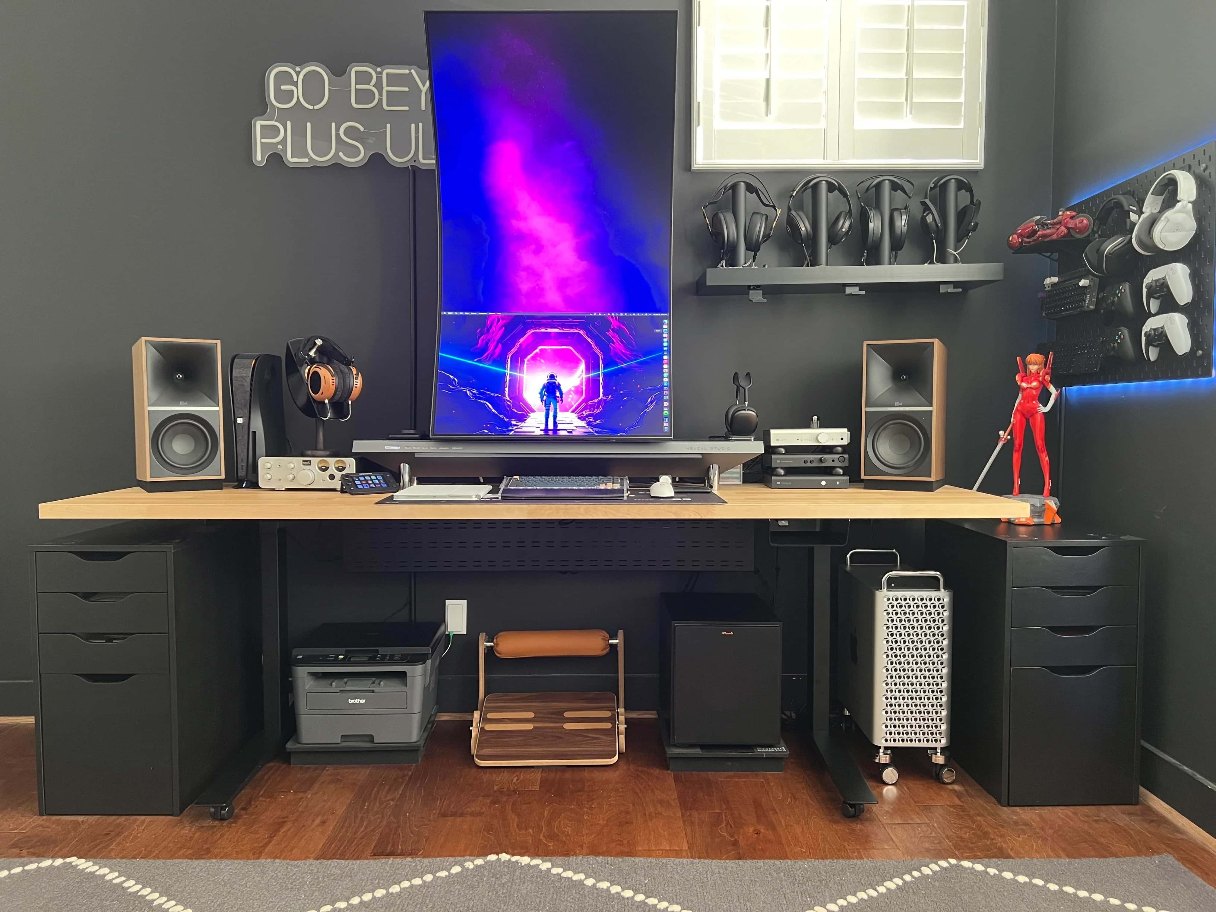 Can you imagine working on that thing, standing so tall as it does? It sits on a stout Hexcal Studio desk shelf with connectivity, lighting and cable-management features.