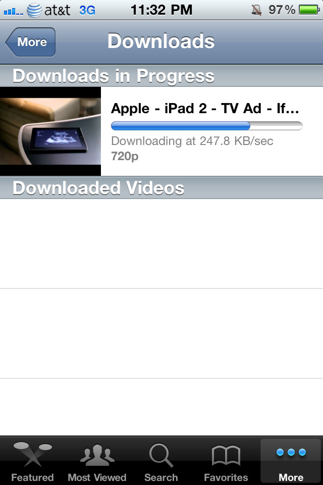 Going to the “More” tab, you’ll notice a new “Downloads” option. Tapping on that will take you to a screen where you can see the videos that are currently downloading, as well as the ones that have been completed.