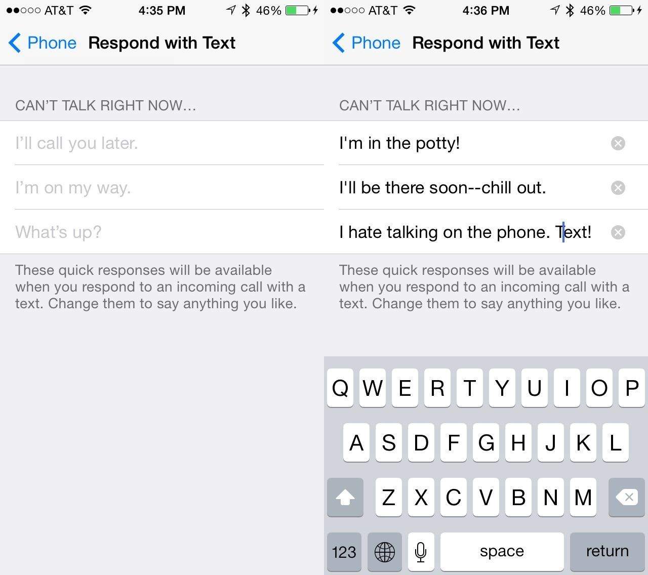 If you choose to reply with a text message, you get a couple of built in replies–Call you later, I’m on my way, What’s up–or you can type a custom message. Ever wanted to change those pre-written messages to be just a little bit funnier? You know you have.