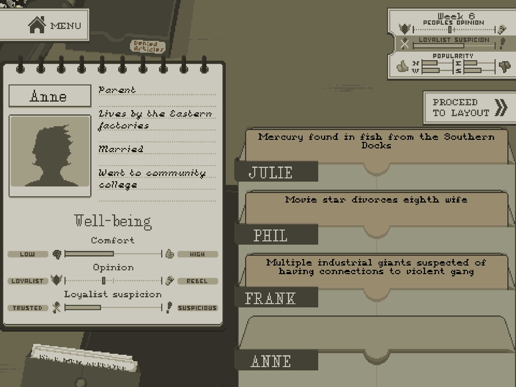The Westport Independent puts you in the role of a newspaper editor in a city that lives under a totalitarian regime. Your job is to edit articles, change headlines, and target advertising to expand your paper’s reach and possibly sway public opinion. But you also have to balance all of that with the fact that fascist governments have a habit of arresting dissidents and rebels and probably killing them. We don’t have all of the facts on this one.