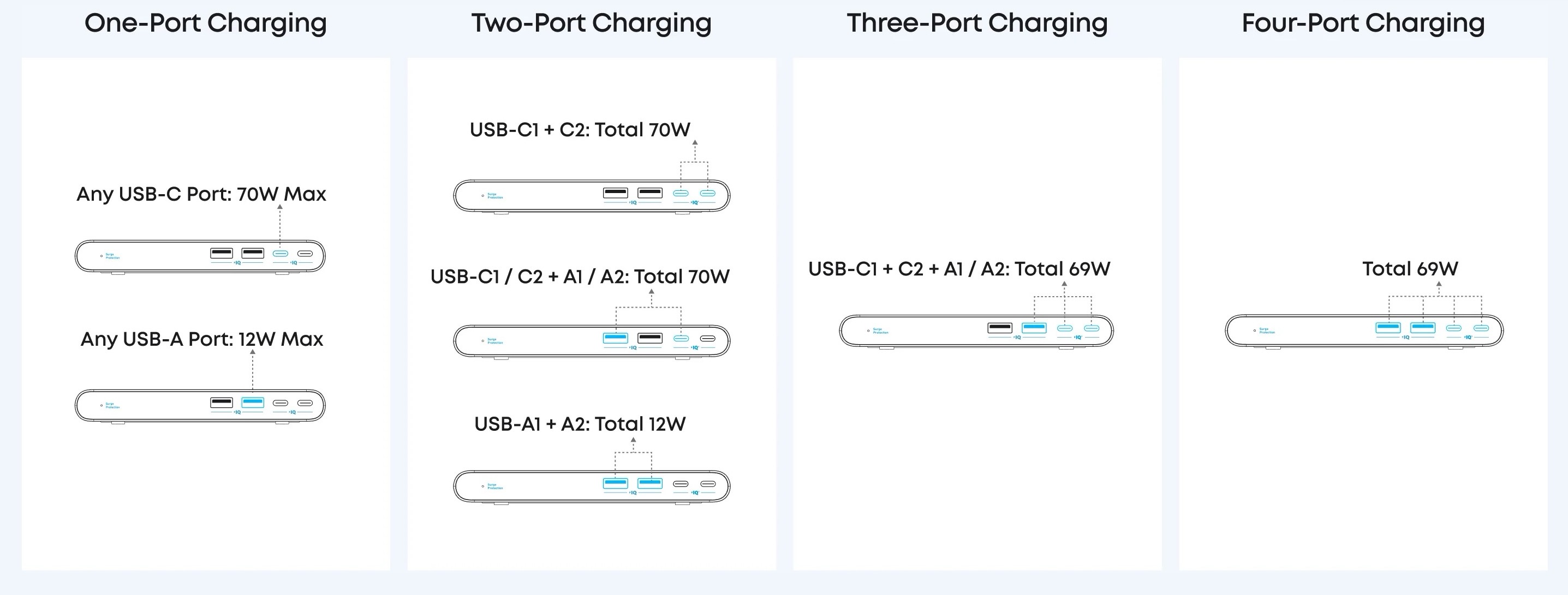 As usual, the amount of power that flows from any of the four USB ports varies depending on how many are in use and what’s plugged into them. The USB-C ports max out at 70W when used alone; use them both at once, and you get a total of 70W, divided between them. (See the chart above for an easy explanation of which ports can deliver how much power in any given usage scenario.)