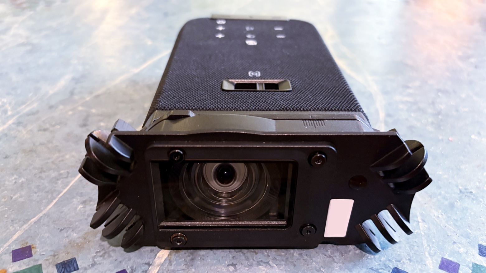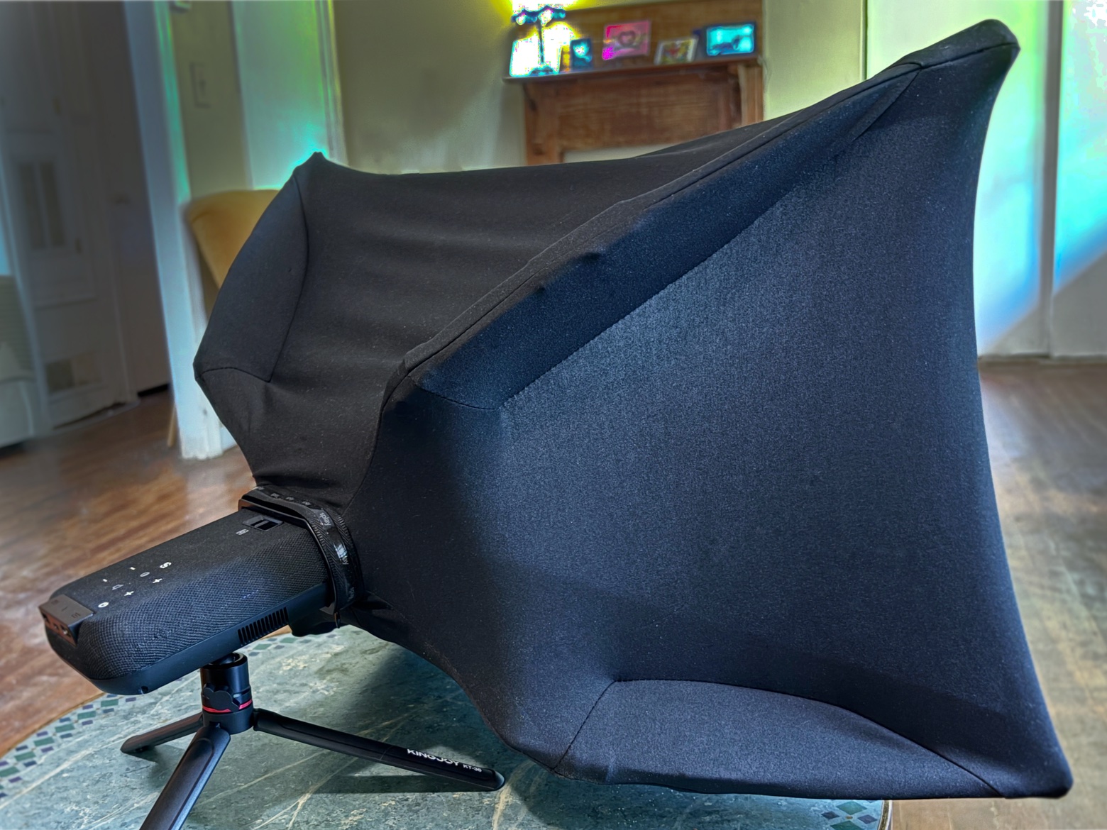 When open, the Splay looks like a CRT monitor from years ago covered in black cloth. The projector sits at the back, where its control buttons and ports are easily accessible.