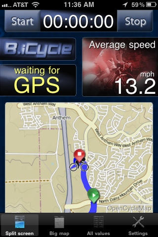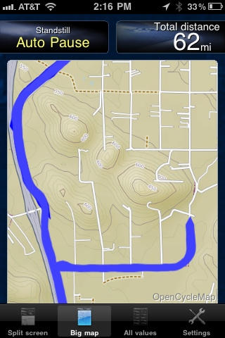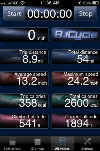 Now, the not-so-good stuff. Even with all these great features, BiCycle lacks features that, for ten bucks, it should have — like Cyclemeter’s calendar log, speed/elevation graphs, and Twitter integration. And the stats-only screen’s info can be a little challenging to take in when glancing down while riding, what with the deluge of info and all the fields being the same size — the ability to customize this screen would be a welcome addition.