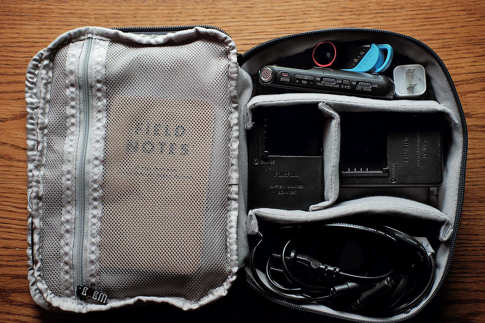 The BUBM case offers two zippered compartments, including one you can customize for your specific carry. In one arrangement, I secured two camera battery chargers and cords with room to spare for some a few small accessories.