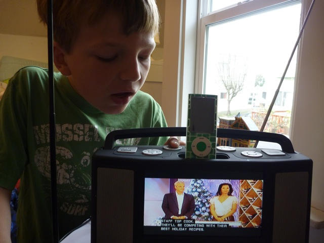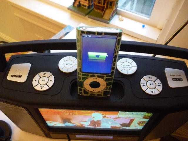 The iPod function is definitely the biggest hit. It fits all iPods and iPhones. We placed an iPod Nano 4 in the slot on the top. The kids can listen to music and watch videos on the screen while the docked iPod is charging.